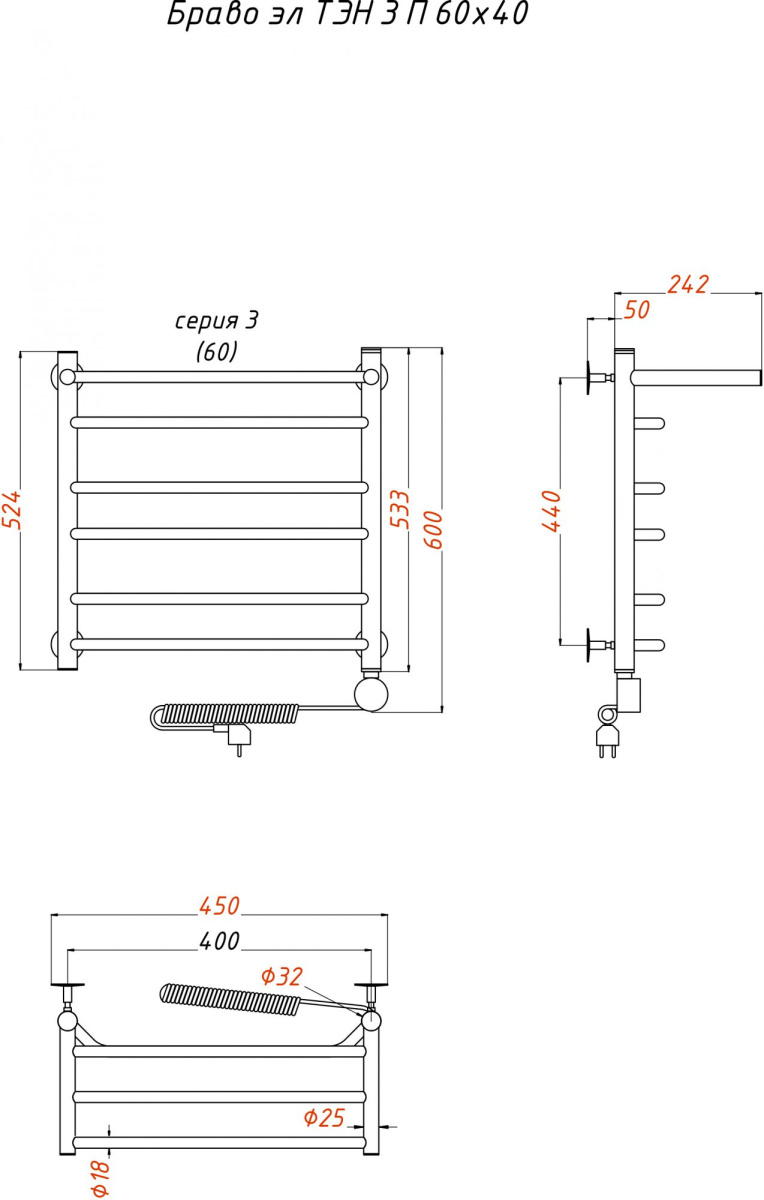 - Полотенцесушитель электрический Тругор Браво эл ТЭН 3 П 60x40